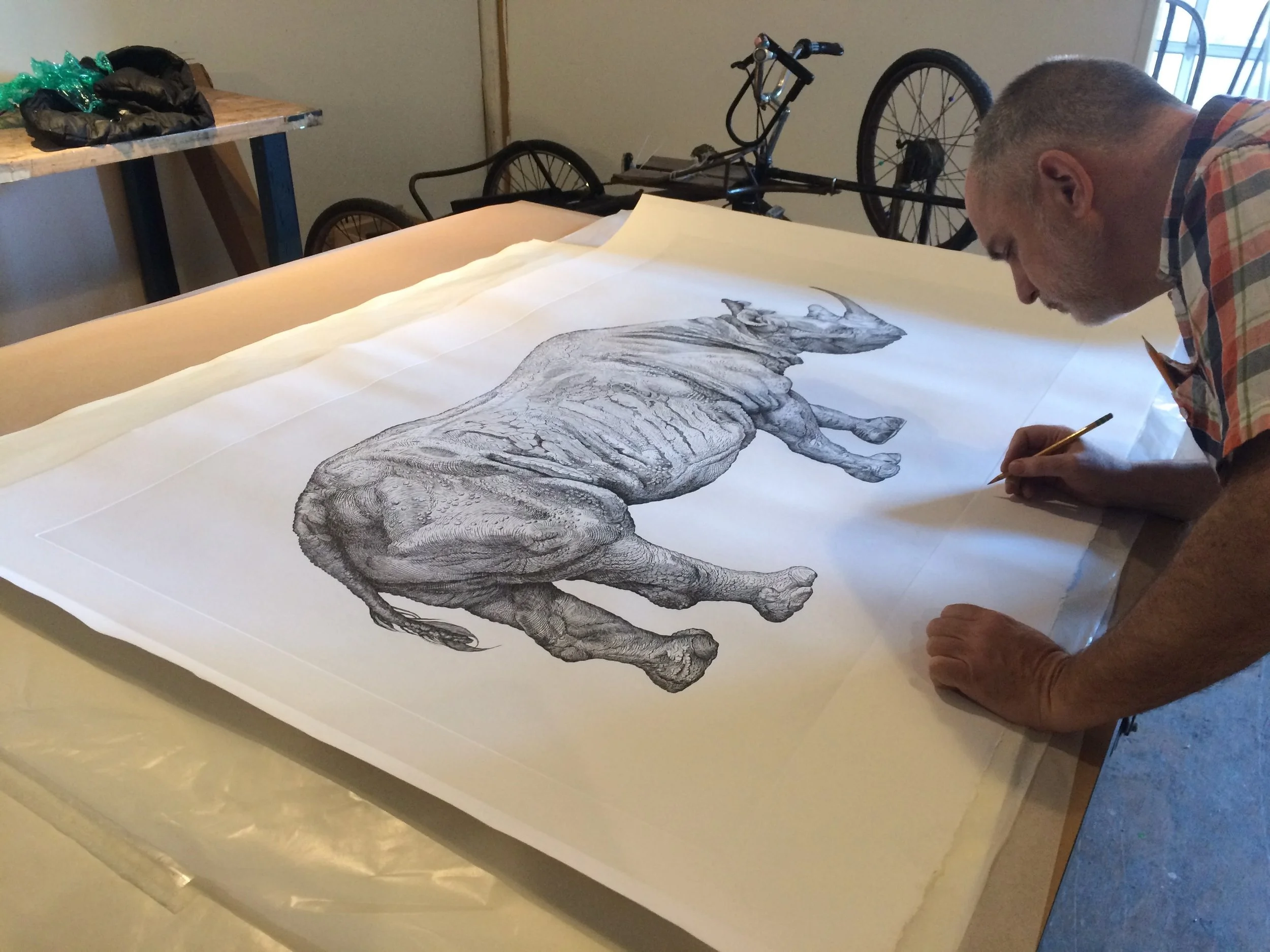 David Barthold is a student of history and a master of the cut line. One of a small group of printmakers working in engraving, a precise way of incising drawn lines into a plate of metal or wood, Barthold carries forward a skill defined in the 16th century. In reference to Albrecht Dürer's Rhinoceros, Barthold has created several detail rich prints all leading up to a uniquely large rhinoceros engraving with a plate size of 32 inches by 55 inches, understood to be among the largest engravings ever accomplished. While all Barthold’s animal prints share a special quality and history, his depictions of Brooklyn’s trees showcase destructive contemporary environments through a timeless subject. These trees are not pruned by master gardeners but take their form from curbs, fences and buildings. In these works, his engraving burin captures a strength and texture gathered through persistence, confinement, abuse, growth and healing.