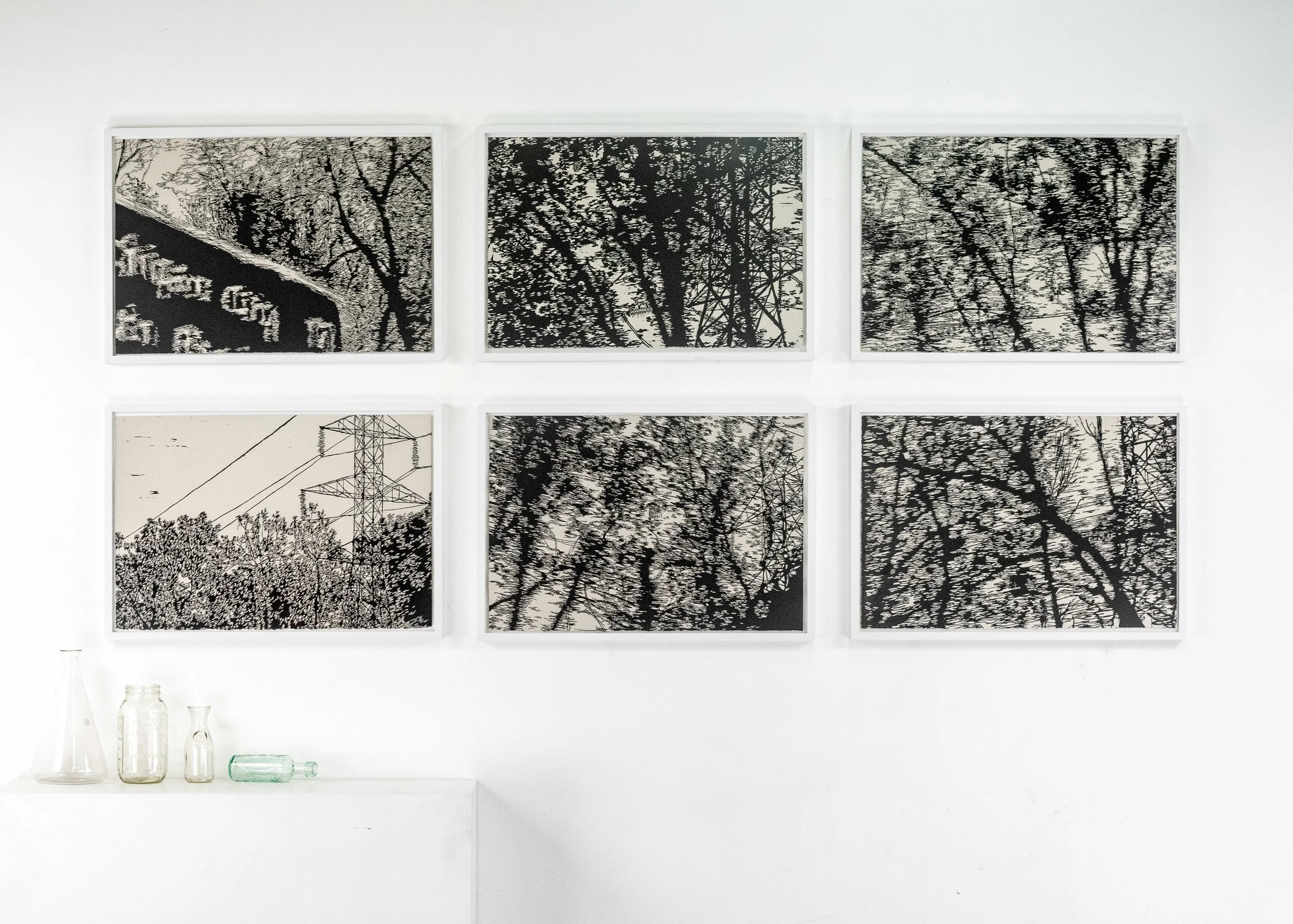 A pervasive theme of my portfolio is the conjunction and dissonance between human development and the natural world’s commitment to persevere under the unyielding onslaught of industrialism. Intricacy and beauty is everywhere in the world around us, and I am drawn to compositions that highlight the tragic beauty in aged decay, overconsumption and forgotten wastelands we encounter every day. Power lines, phone cables, and chain-link and barbed wire fences are installed, revised, outdated and forgotten, leaving behind dense webs of steel through which the the natural world is constantly attempting to reclaim its space. I love the challenge of translating these elements into woodcut. Cables and wires silhouetted against a clear sky are elements positively drawn over deep negative space, and in carving I invert this relationship, investing my effort into the areas carved away, the blank spaces. My discipline and care is leaving behind and untouched the intention of the original artwork, that fence, cable, tree or vine that exists in the real world.